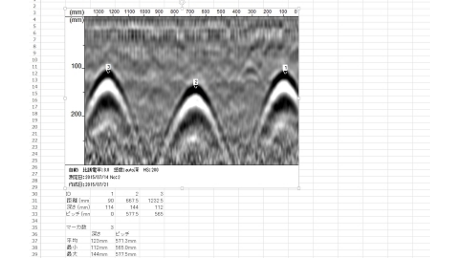 エクセルデータにて、鉄筋などの探査画像、ピッチ、かぶり、平均値をメールにてご提供できます。